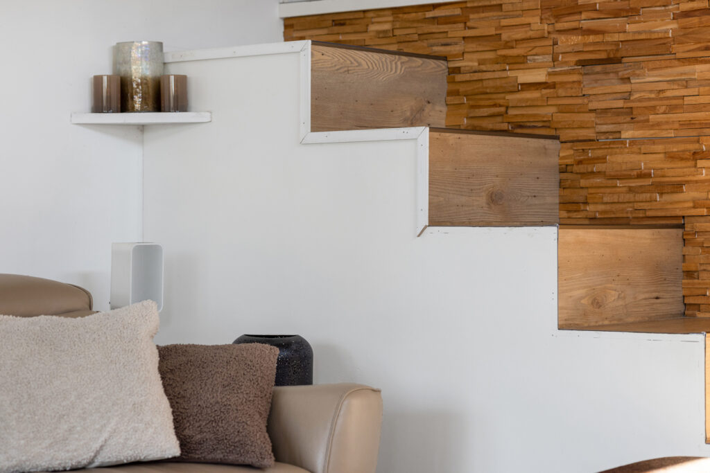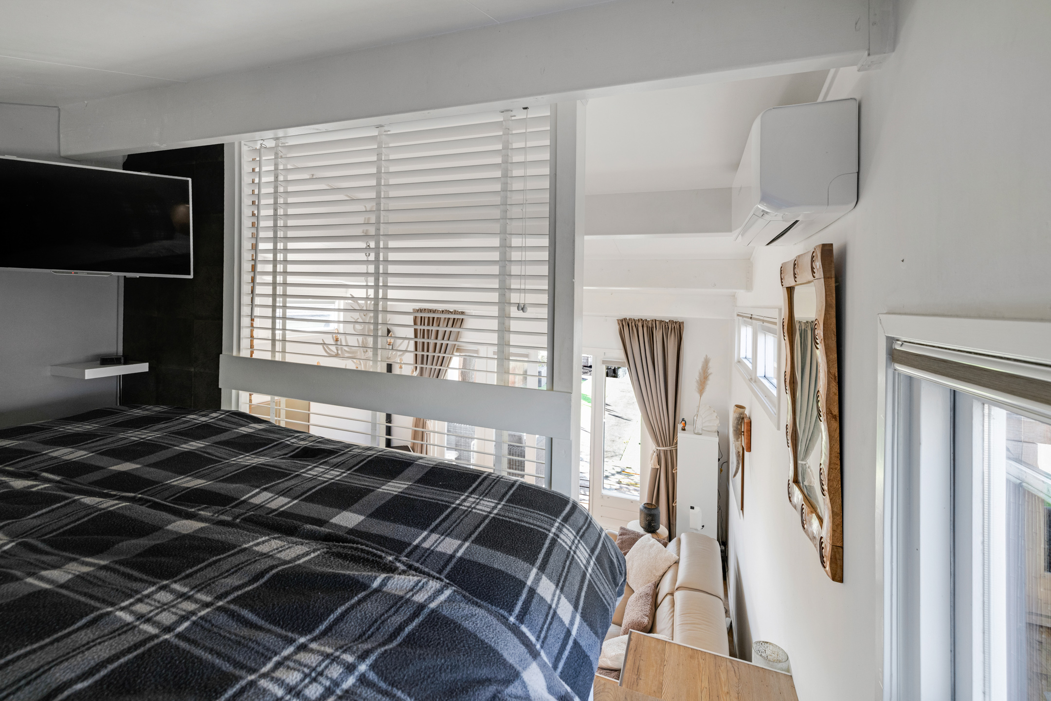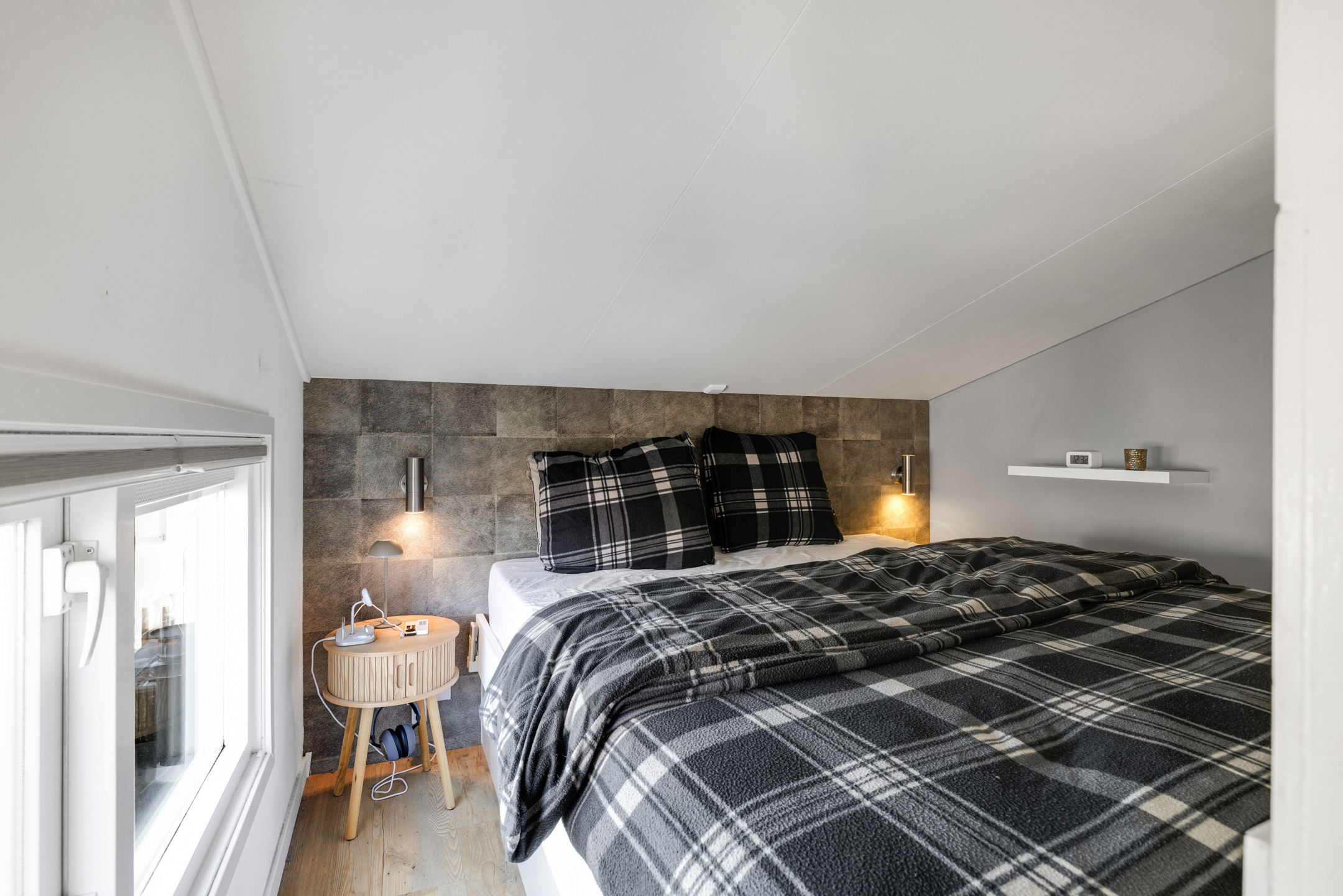 De slaapkamer is gesitueerd in een hoger gelegen niveau in het huisje. Via een vaste blok-trap komt men in de slaapruimte.