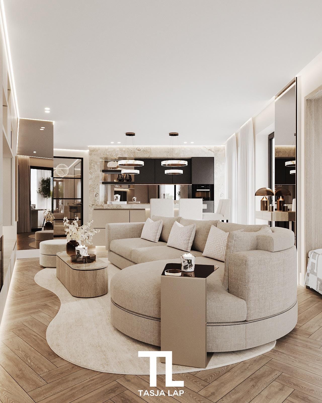 * Woonkamer met grote ramen, een speelse erker en balkon op de hoek