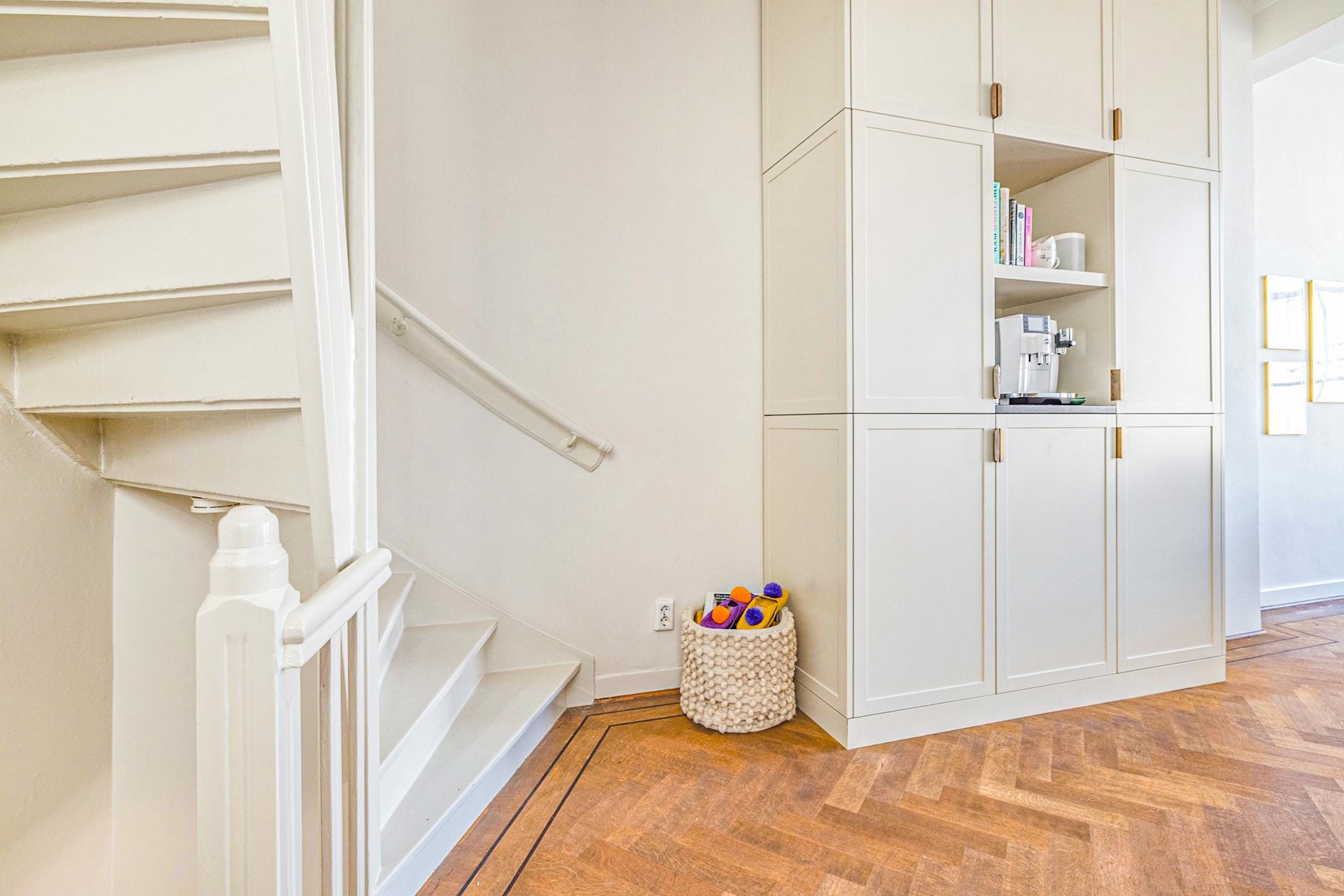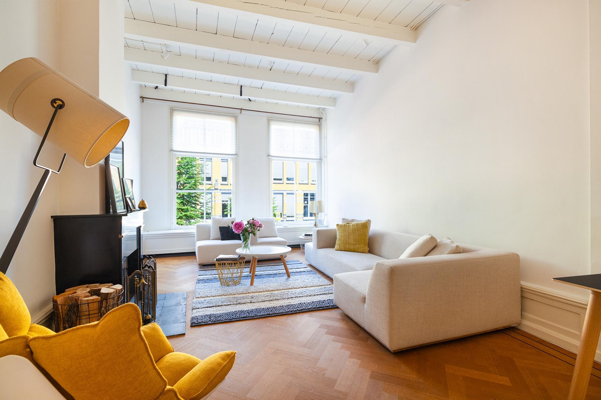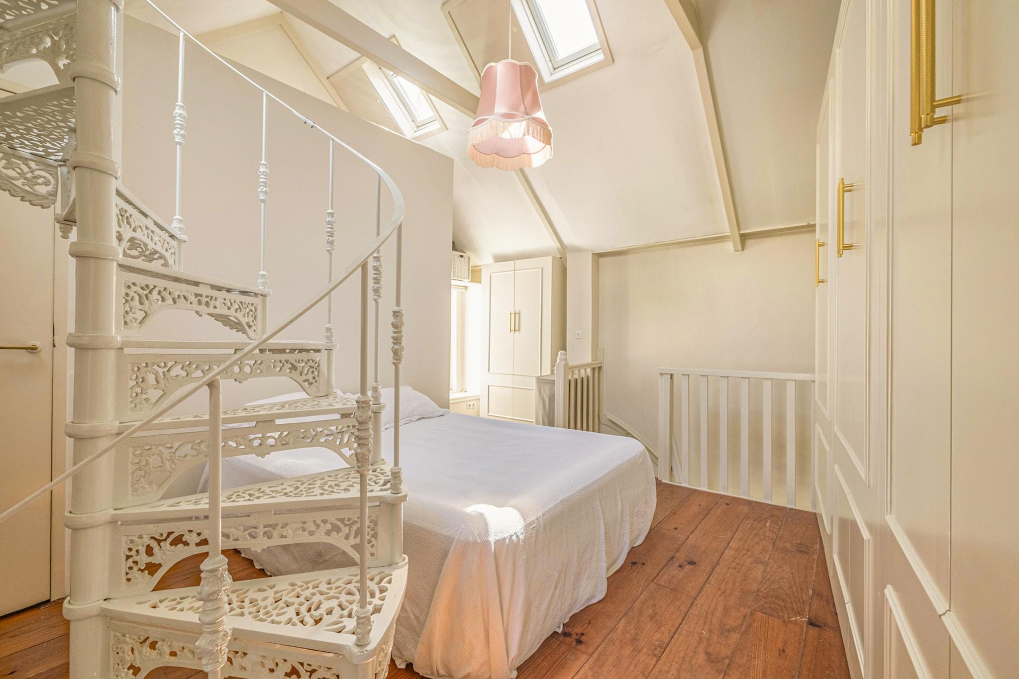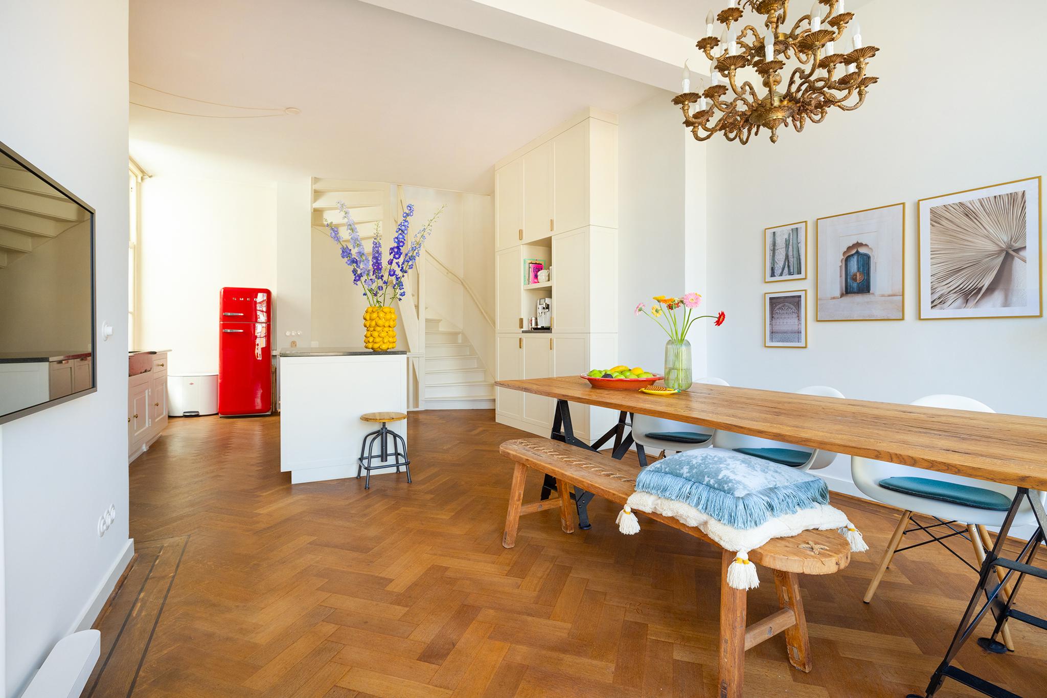 Op de eerste verdieping vindt u een sfeervolle living met open haard. De tweede verdieping herbergt een luxe leefkeuken met een klassiek AGA fornuis – een plek waar koken en gastvrijheid samenkomen. De bovenste verdieping biedt een ruime slaapkamer met inbouwkasten, een stijlvolle badkamer en directe toegang tot het zonnige dakterras.