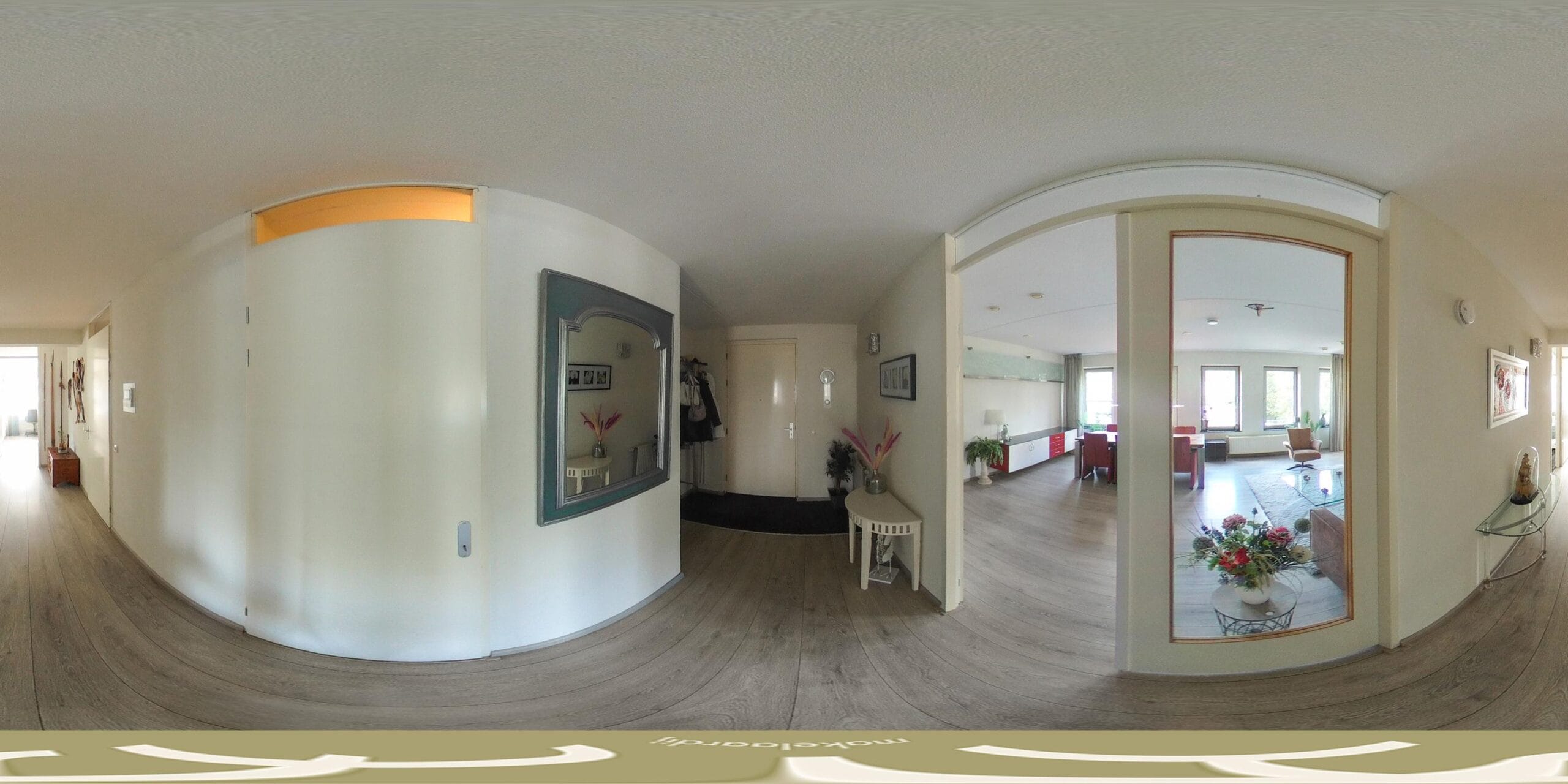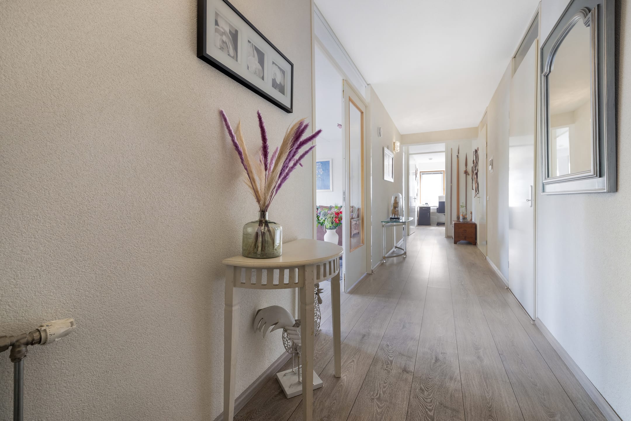 Ruime entree met meterkast en garderoberuimte. Vanuit de L-vormige hal bereik je het toilet met fonteintje, de slaapkamers, badkamer en woonkamer.