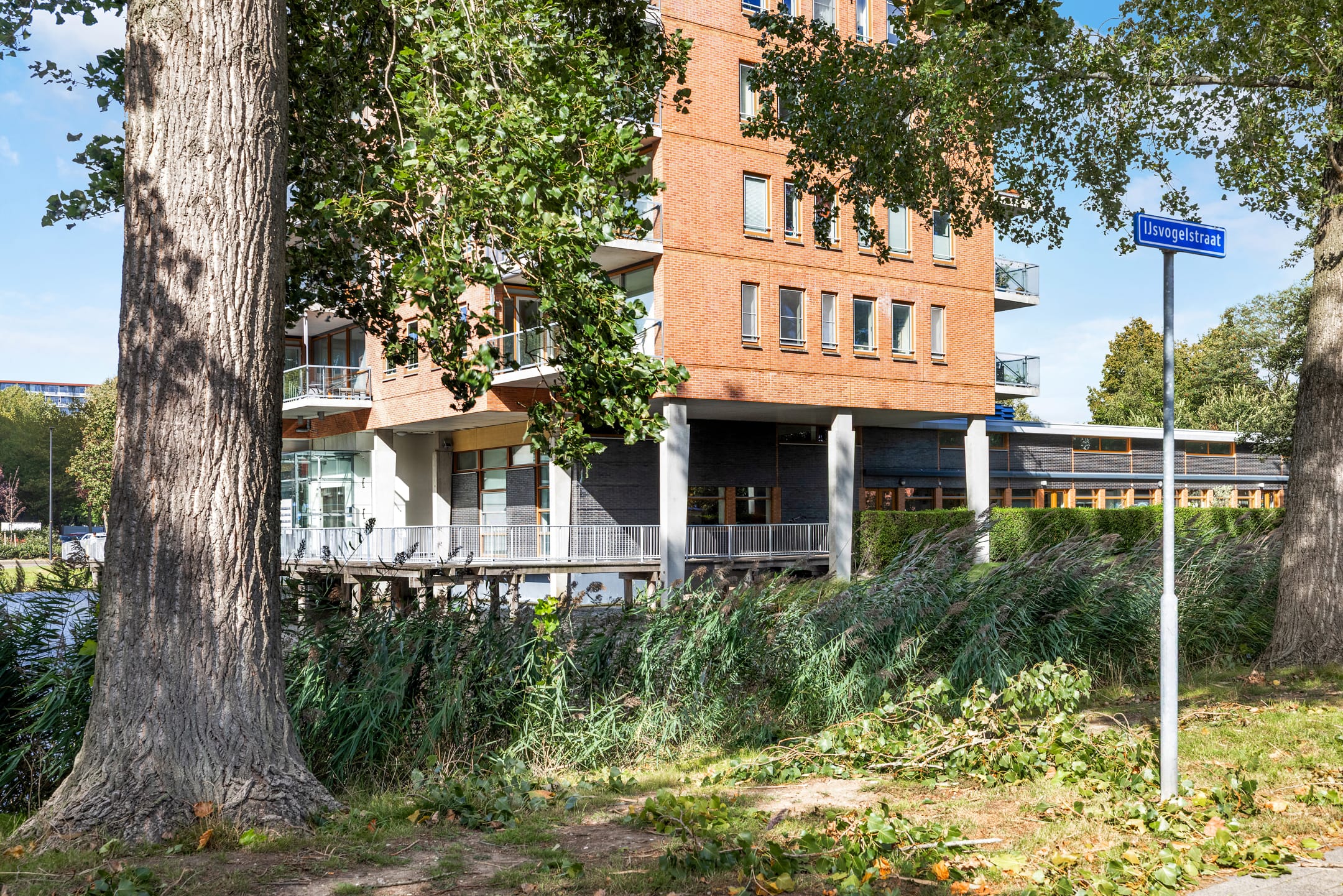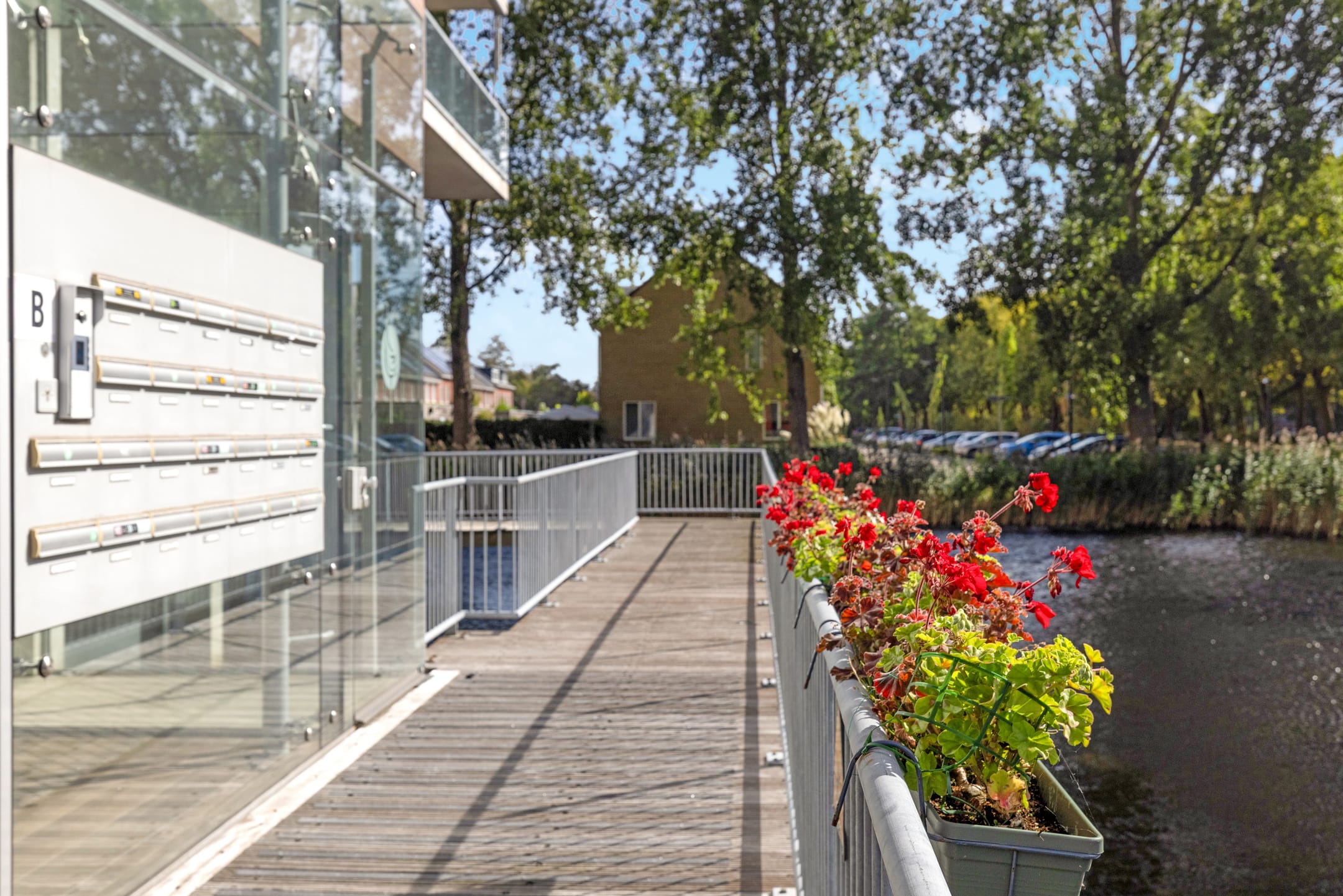 Toegang tot het complex via een houten loopbrug over het water. De centrale entree is stijlvol en licht, voorzien van video-intercom en twee liften naar de woonlagen en parkeerkelder.