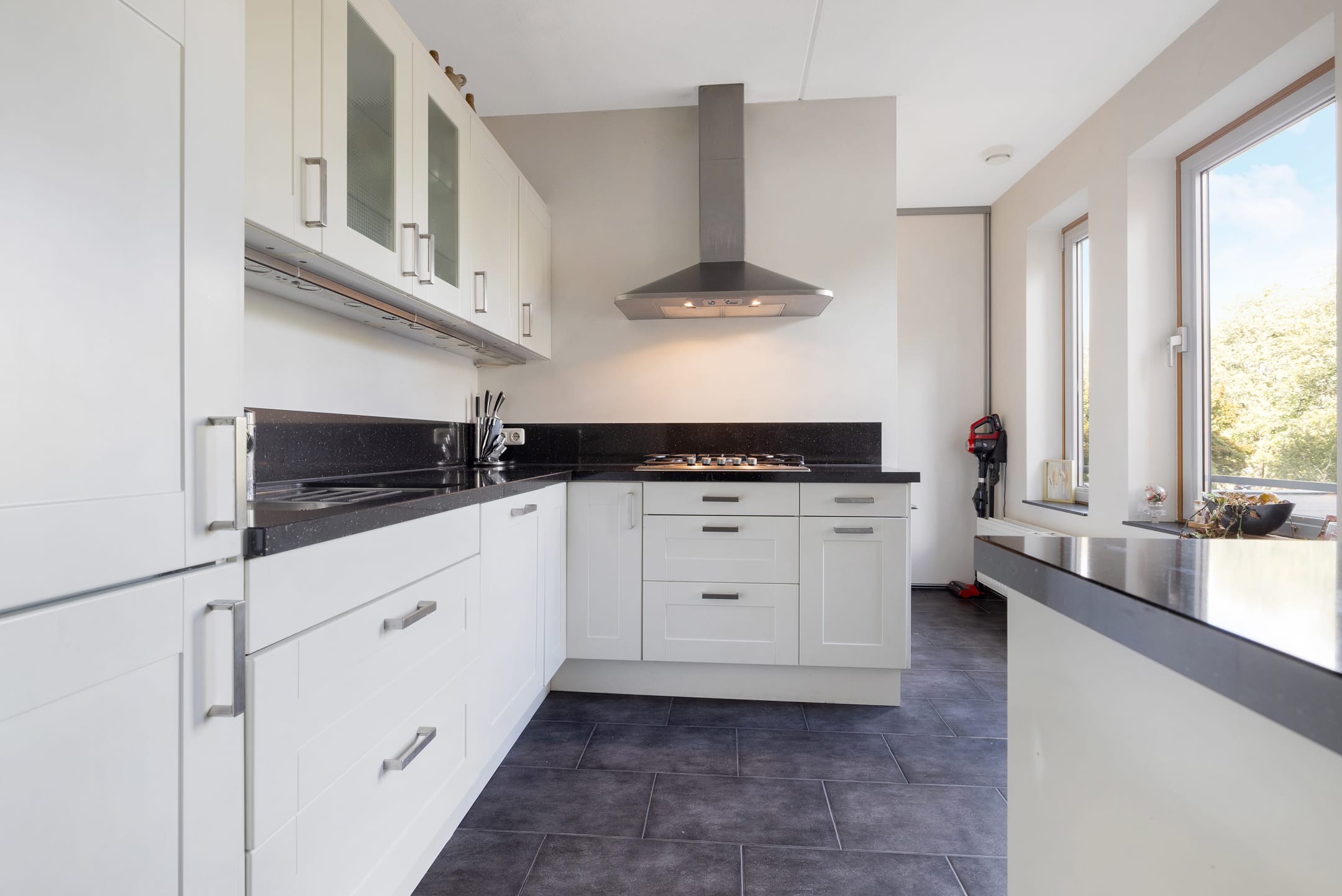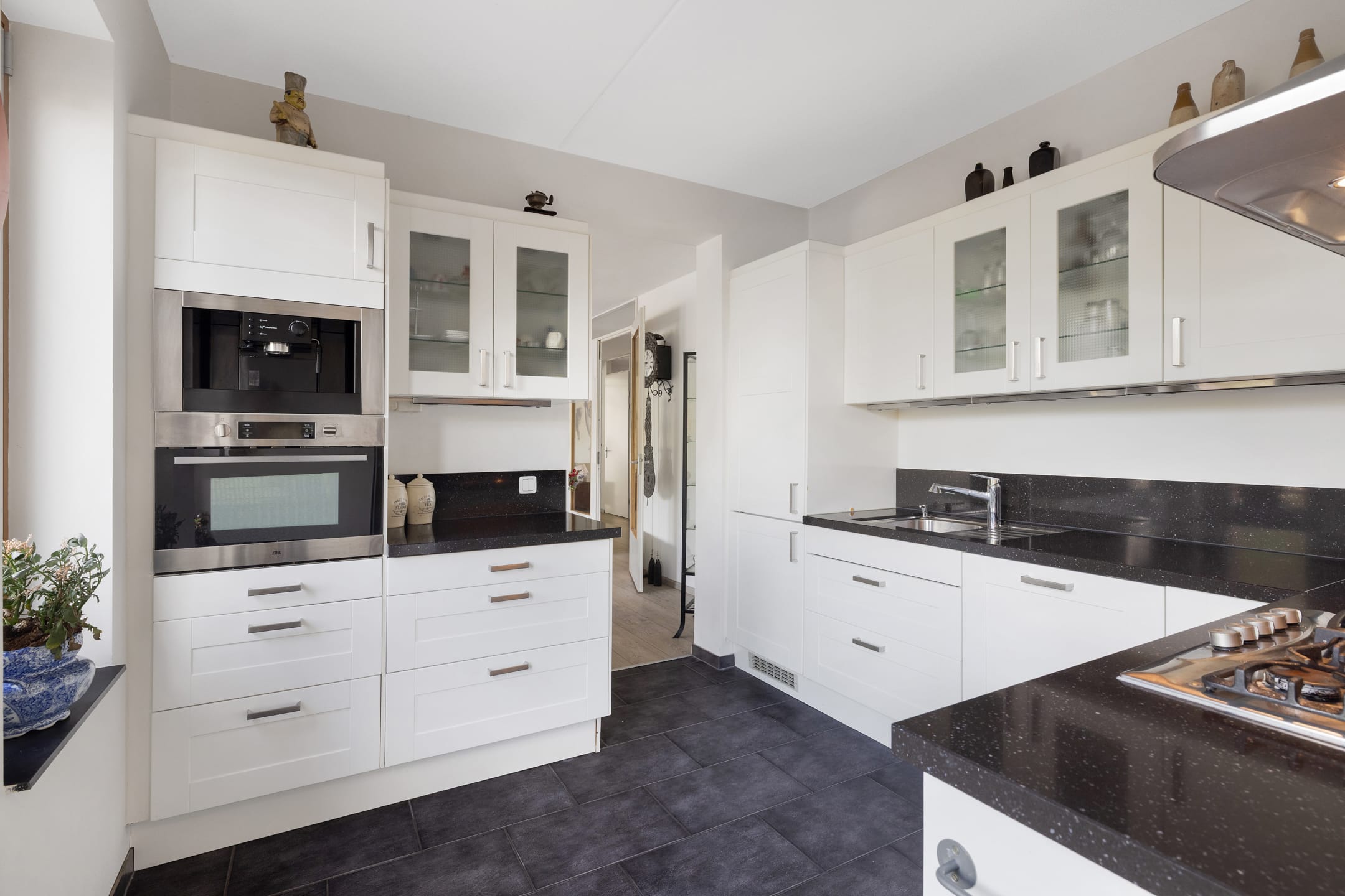 De gesloten keuken ligt apart van de woonkamer en is praktisch ingericht in L-opstelling, voorzien van diverse inbouwapparatuur zoals een koelkast, vriezer, combi-oven, vaatwasser en gaskookplaat met afzuigkap. Aansluitend vind je de handige bijkeuken met extra bergruimte.