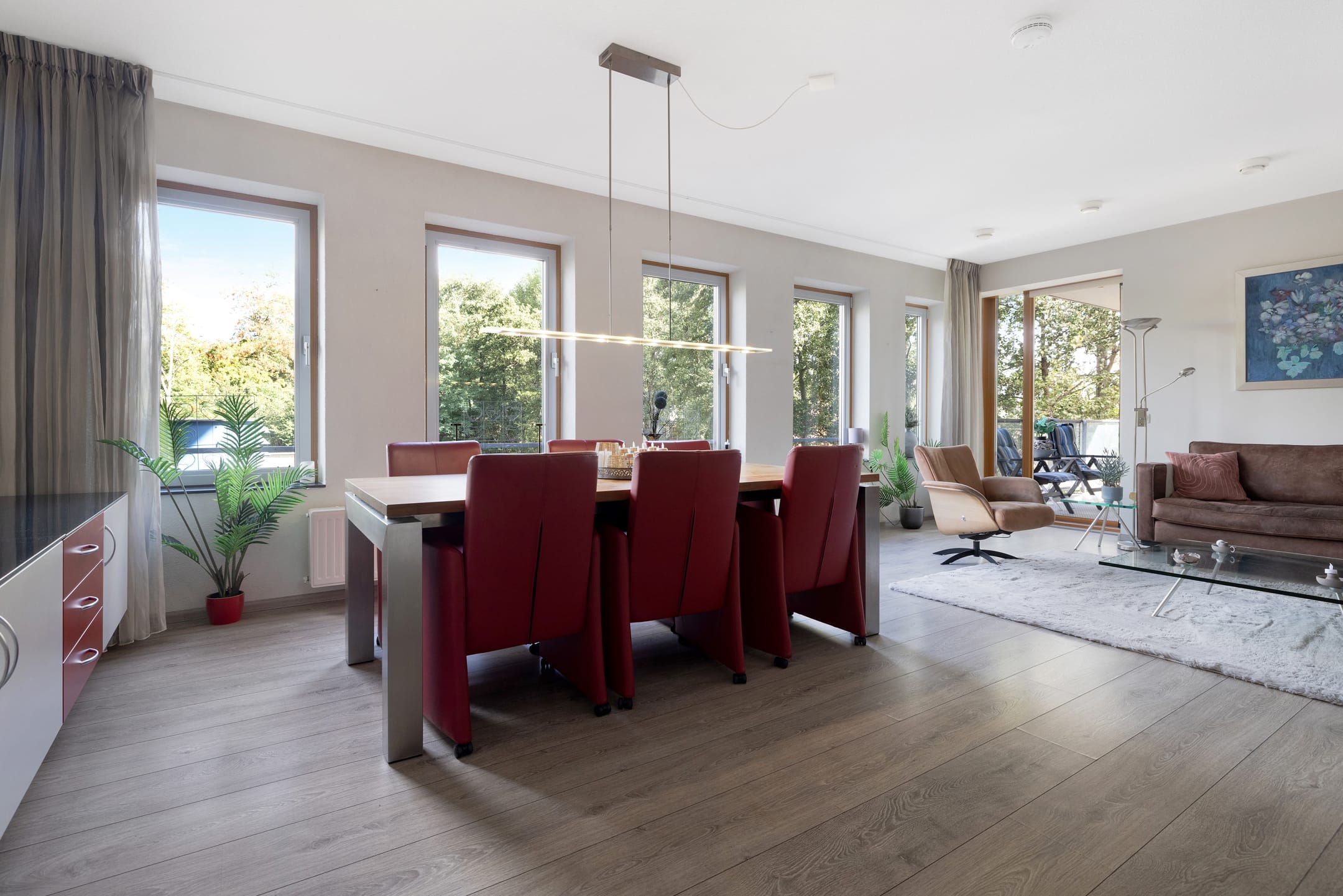 **Zeer ruime en lichte woonkamer met vijf grote ramen én deur naar het terras