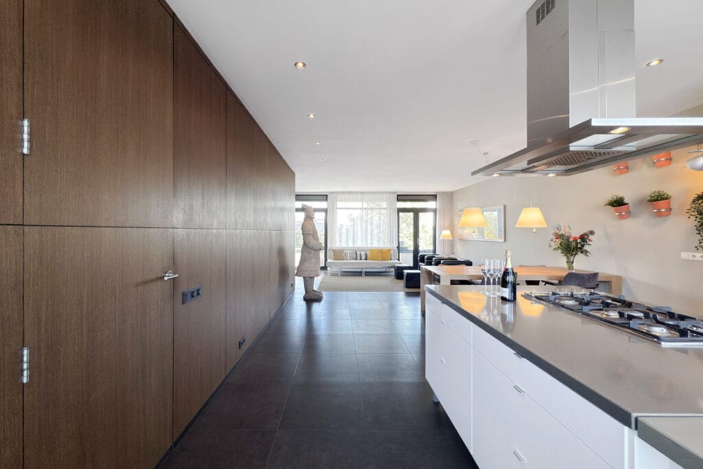 Zeer ruime woon-eetkamer voorzien van een moderne plavuizen vloer. Deze ruimte is tevens voorzien van een moderne keuken met een kookeiland en heeft de benodigde inbouwapparatuur. Onder de trap is kastruimte gecreëerd en verder heeft de ruimte een balkon aan de achterzijde alsmede aan de voorzijde die via openslaande deuren te bereiken zijn.
