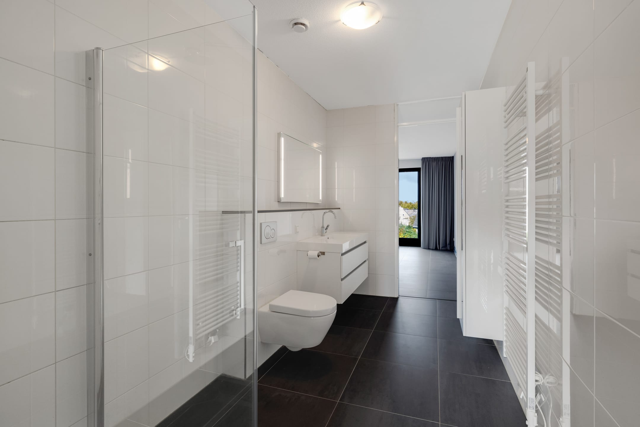 * Moderne badkamer met inloopdouche, 2e toilet, wastafel en handdoekradiator.